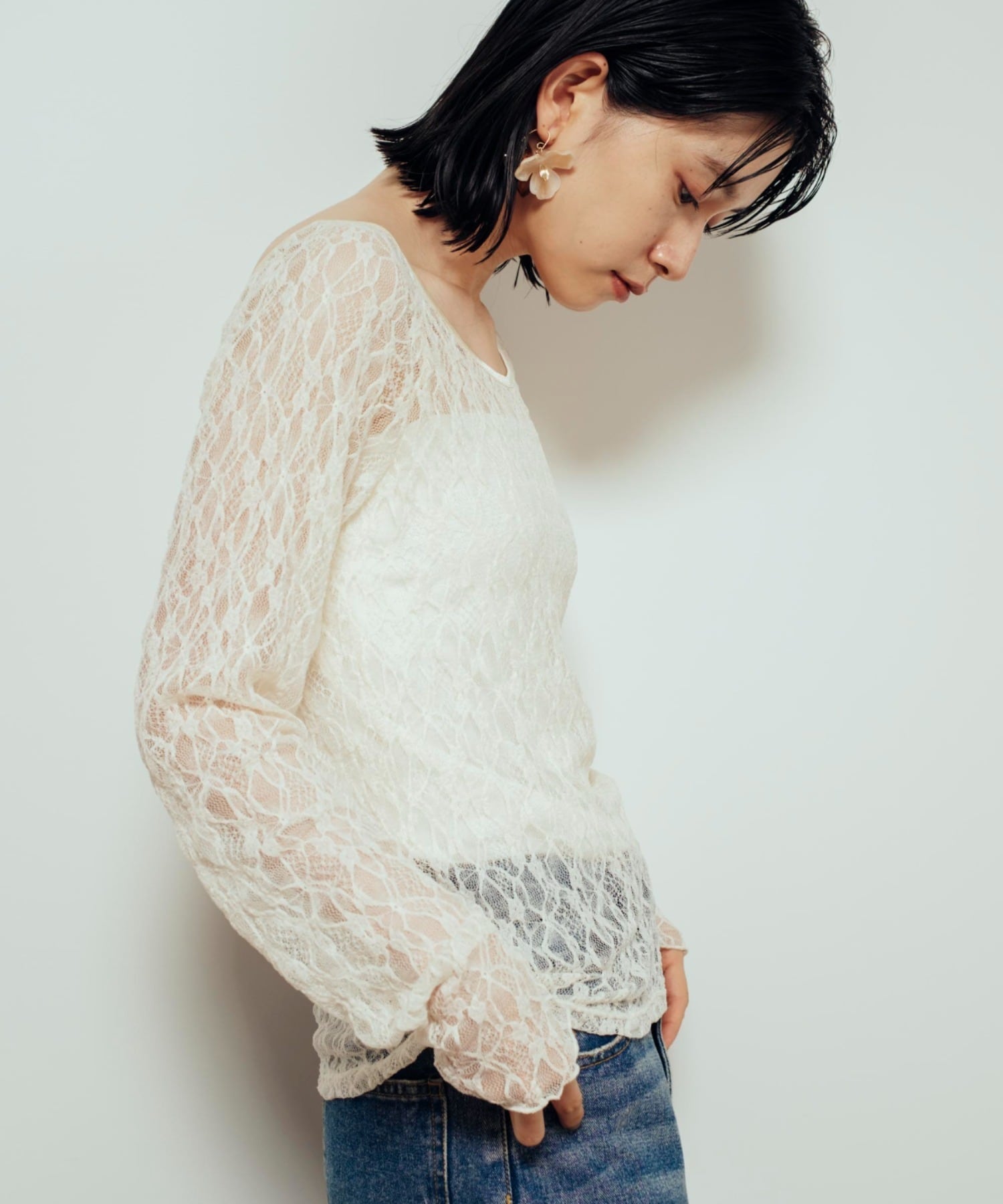 ・繊細なフラワーレースが上品に透ける、シアー素材のフェミニントップス