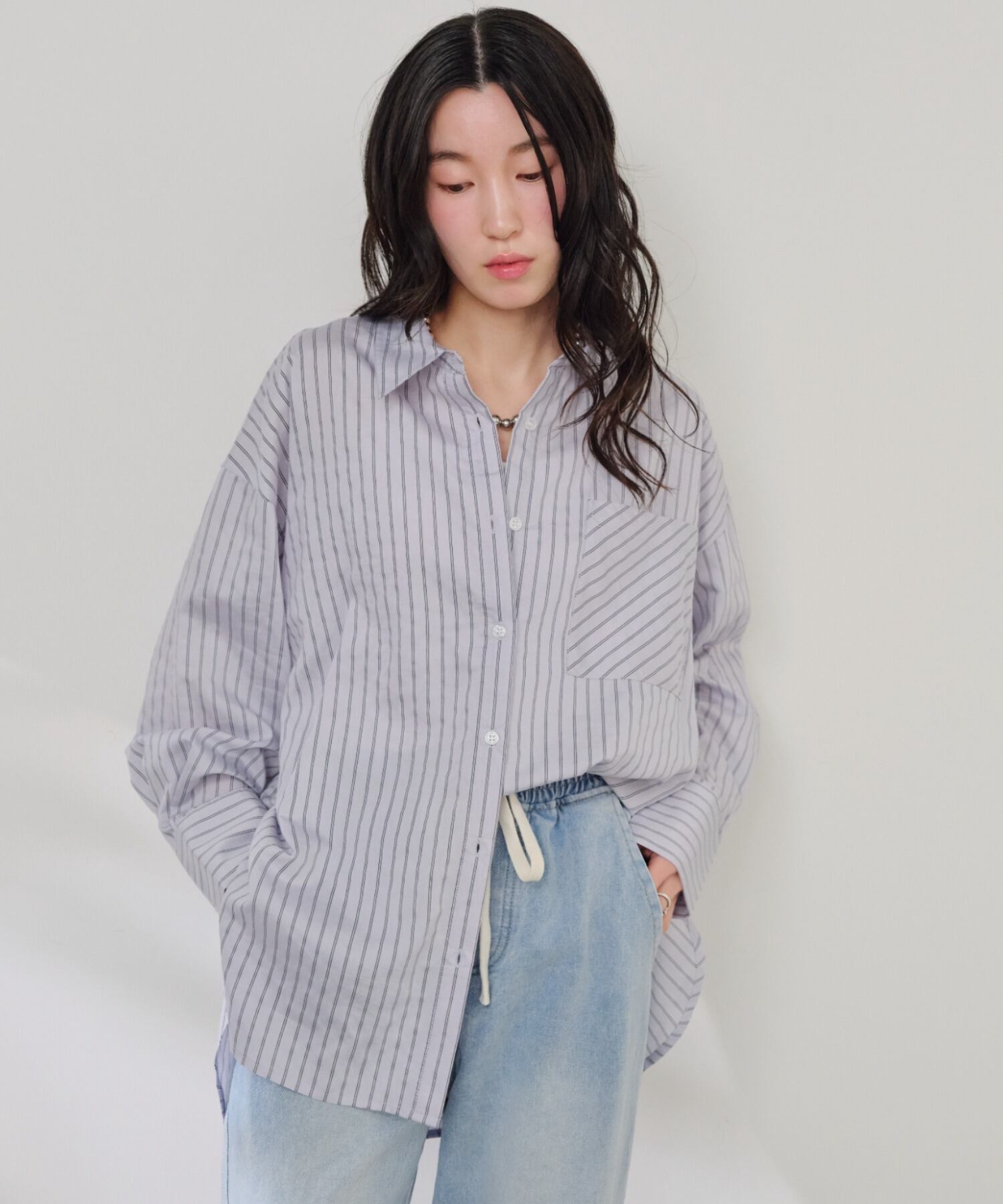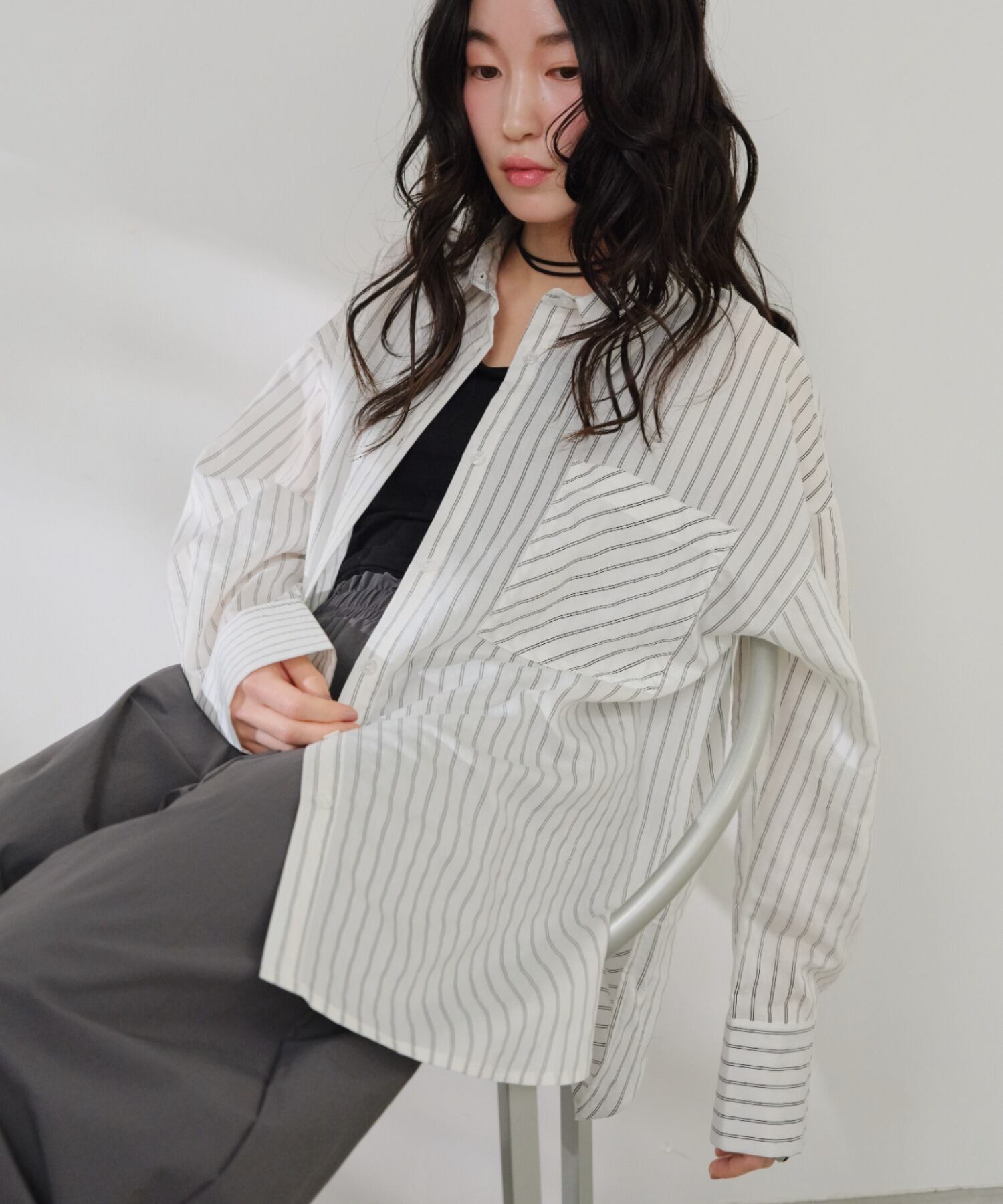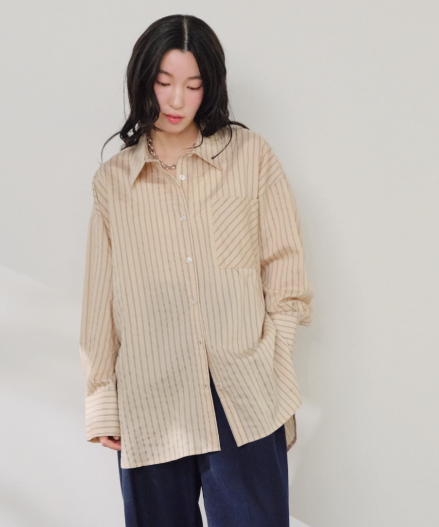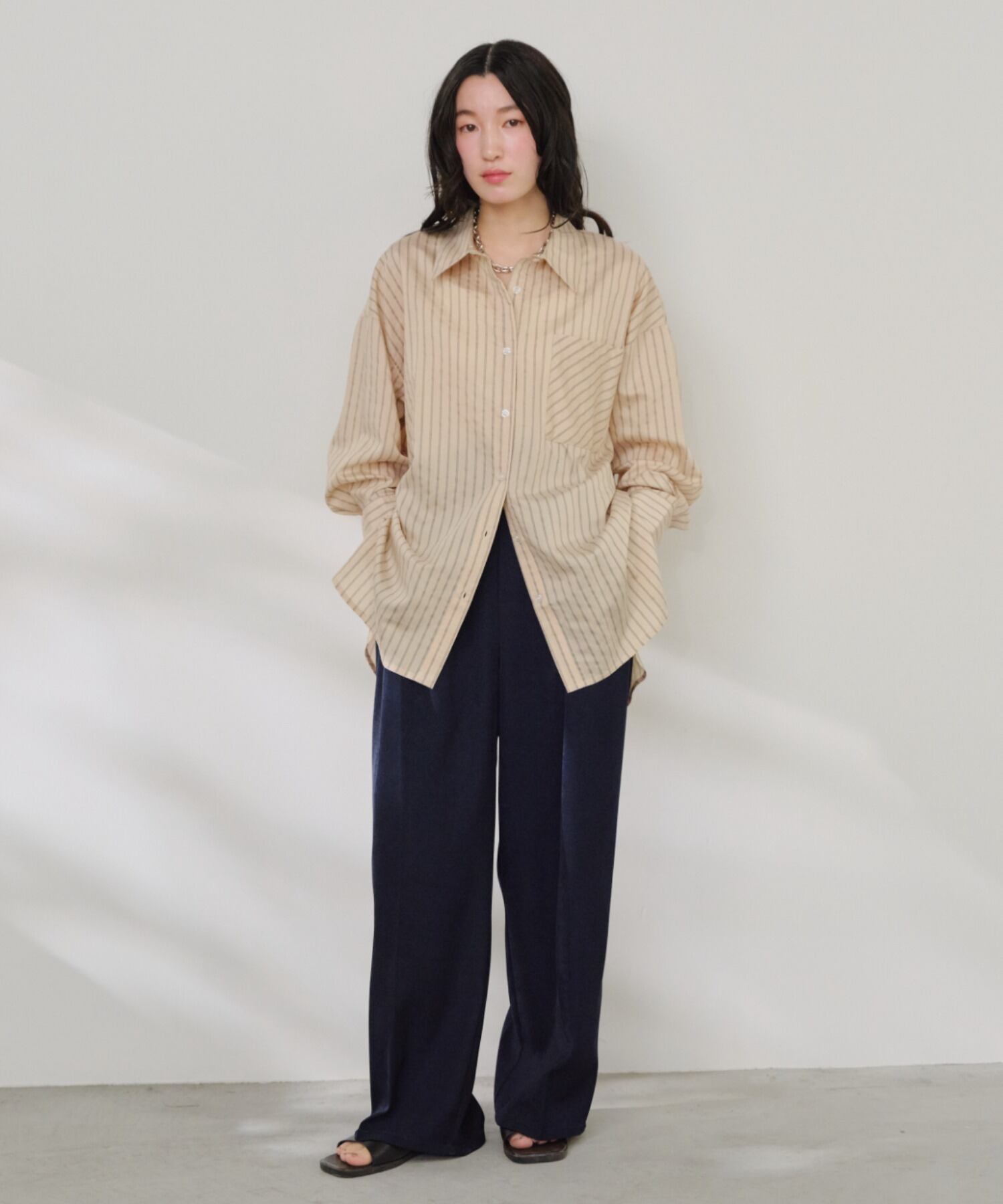 ・軽やかなシアー素材に細ストライプをのせた、大人の抜け感シャツ。