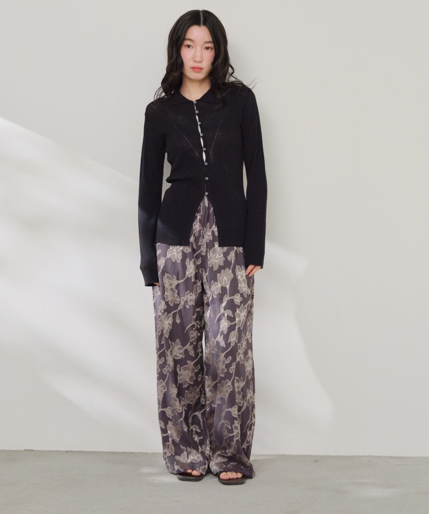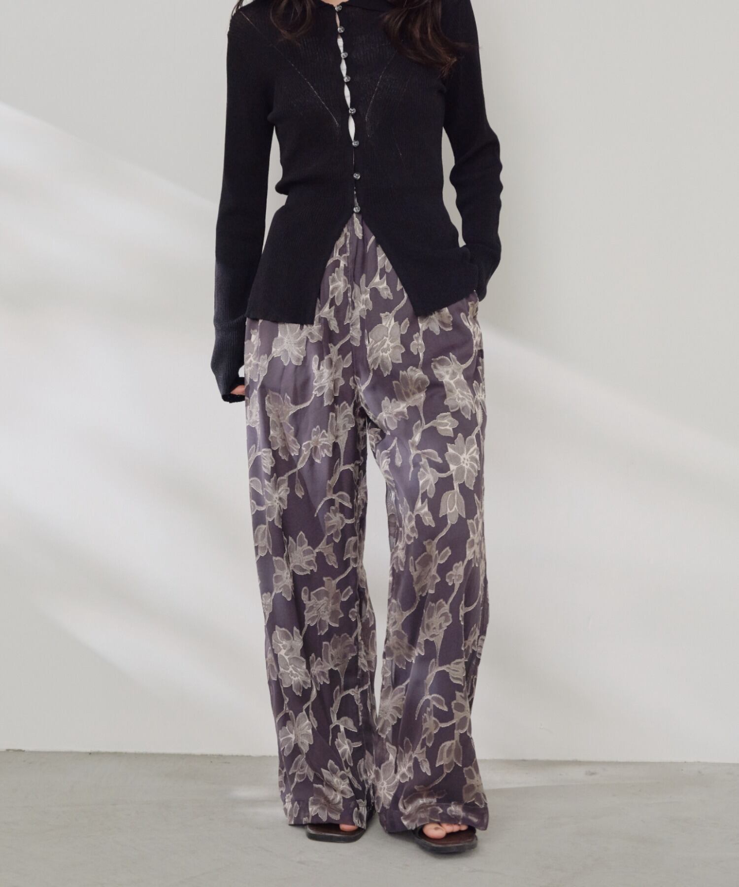繊細なフラワー模様を重ねた上品なイージーパンツ。