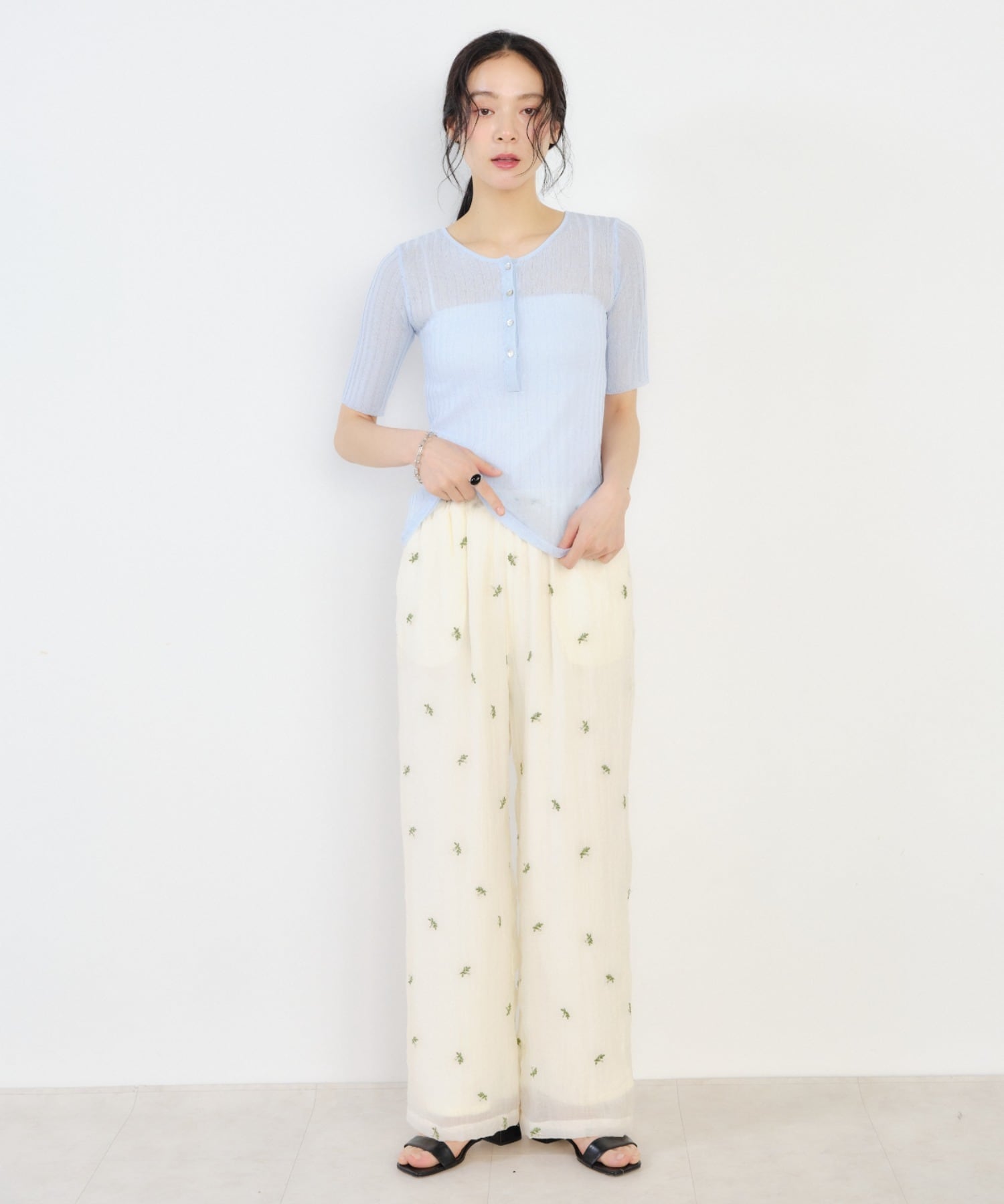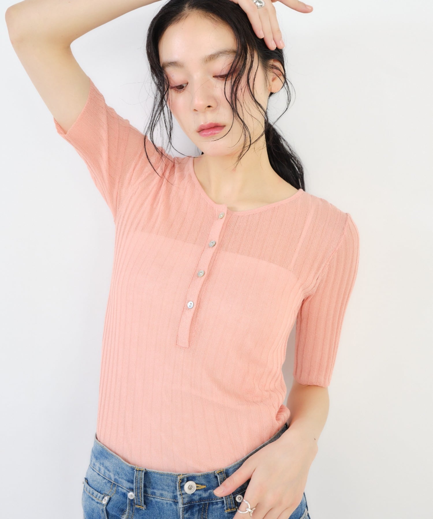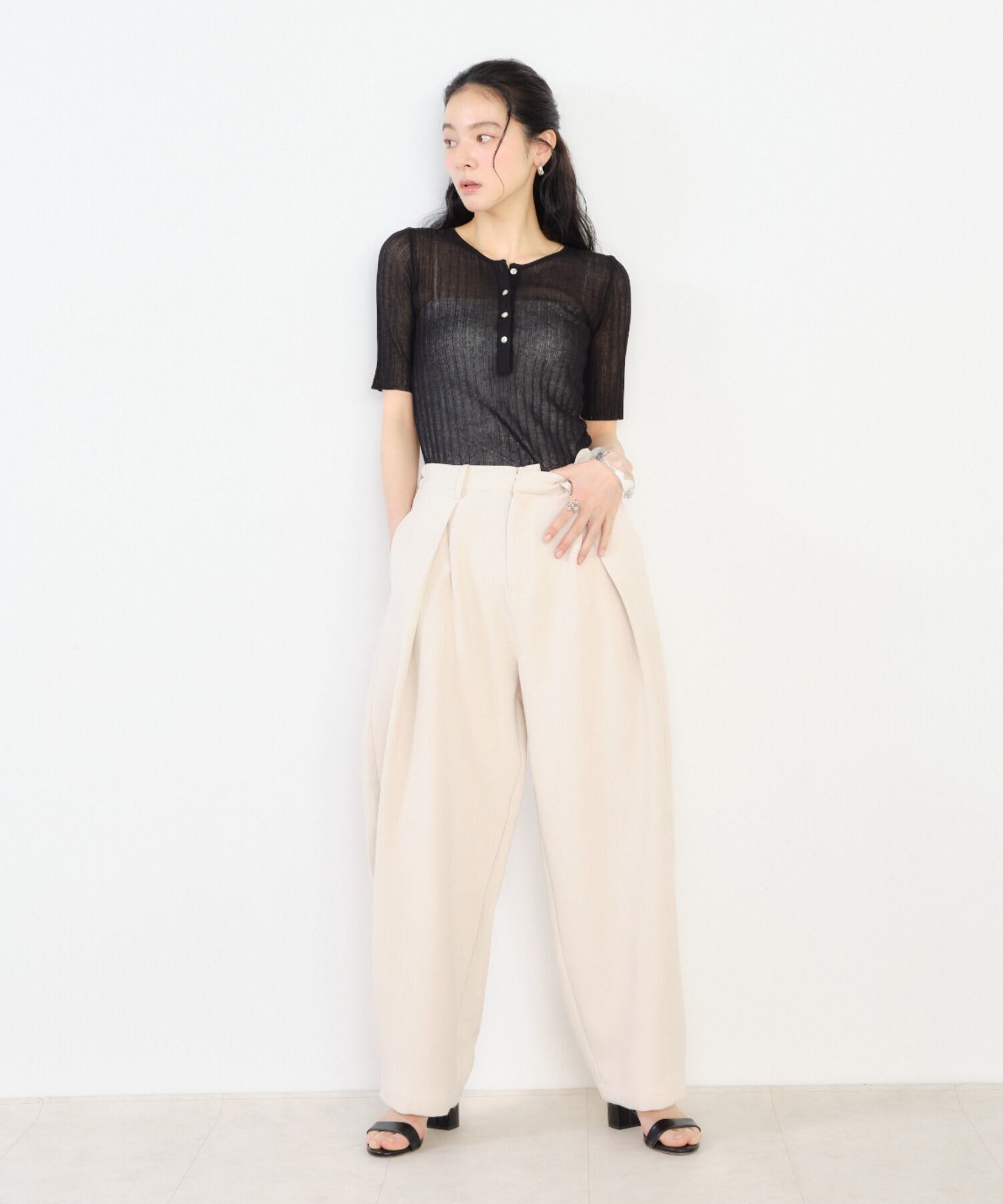 ・フロントのヘンリーネックデザインがアクセントになり、シンプルながらもこなれた印象に。
