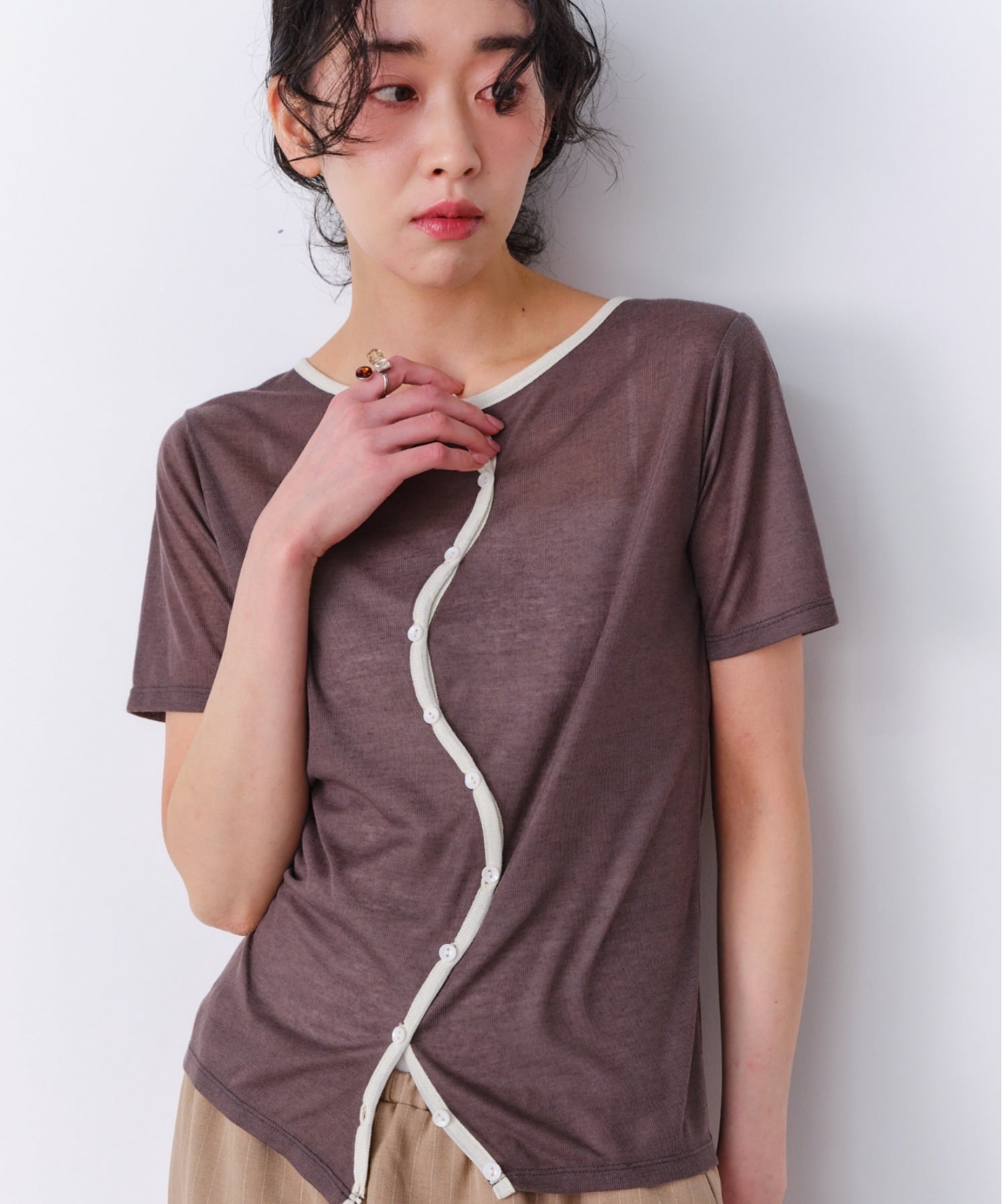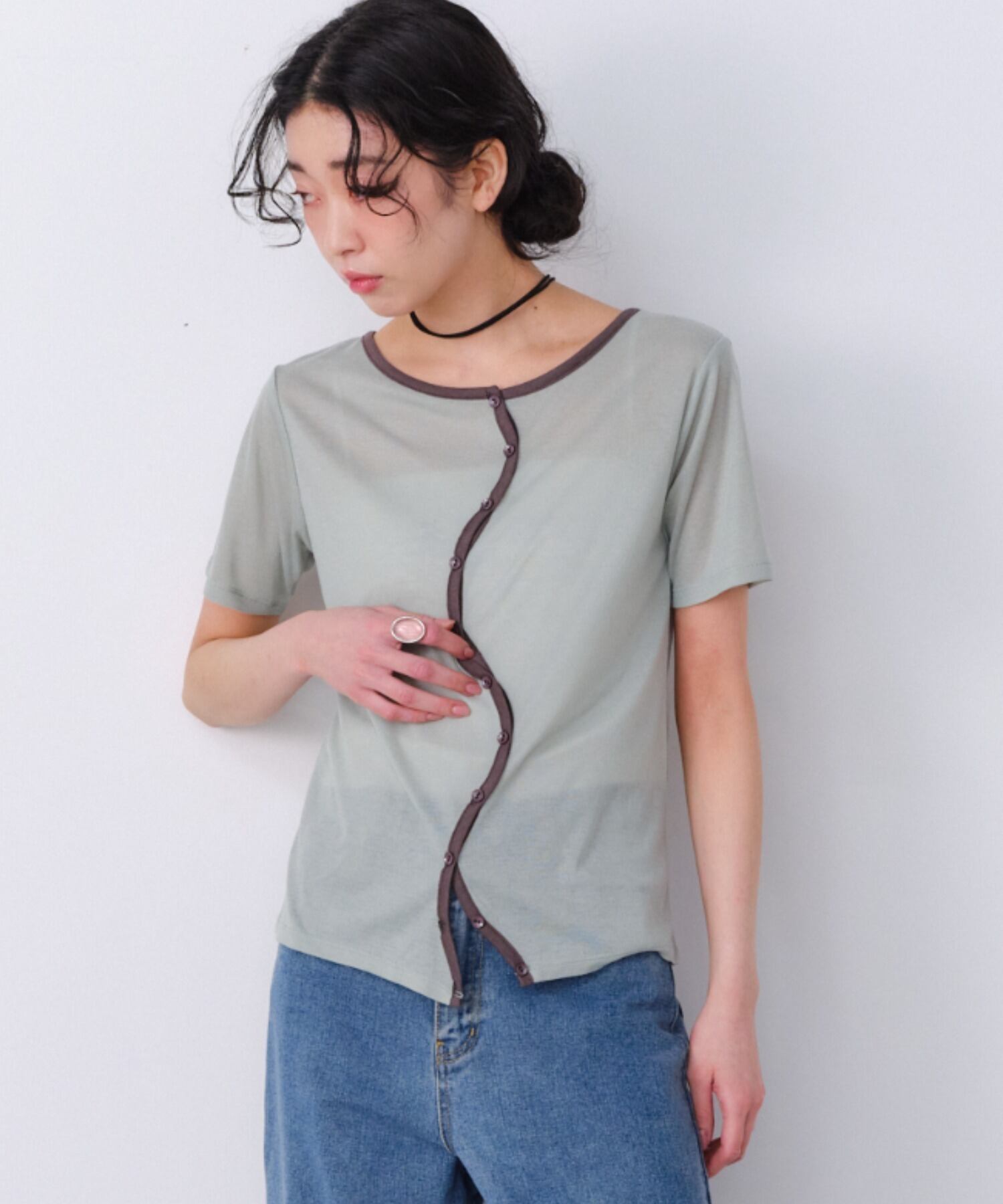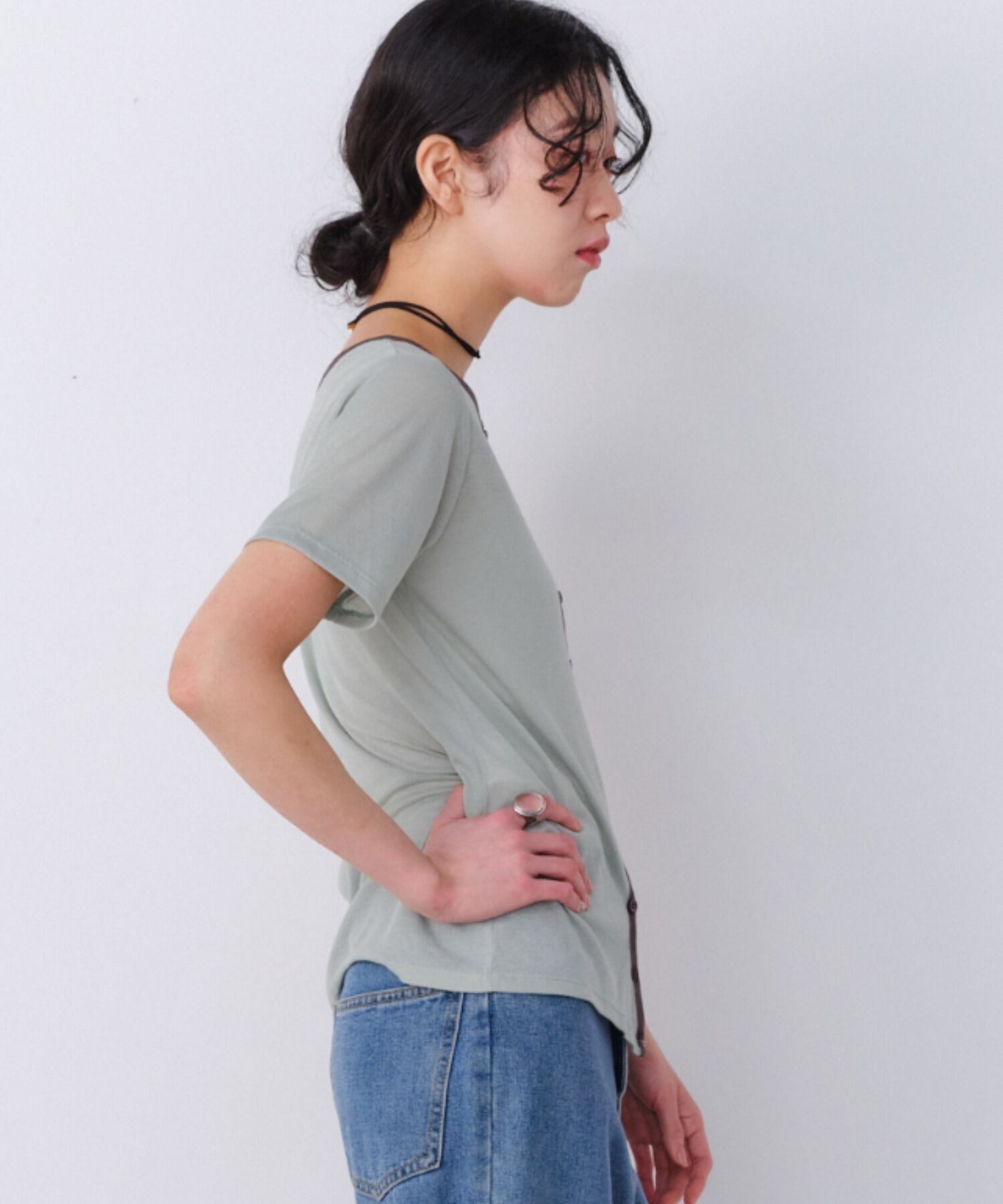 ・フロントのデザインボタンが目を惹く半袖プルオーバー。